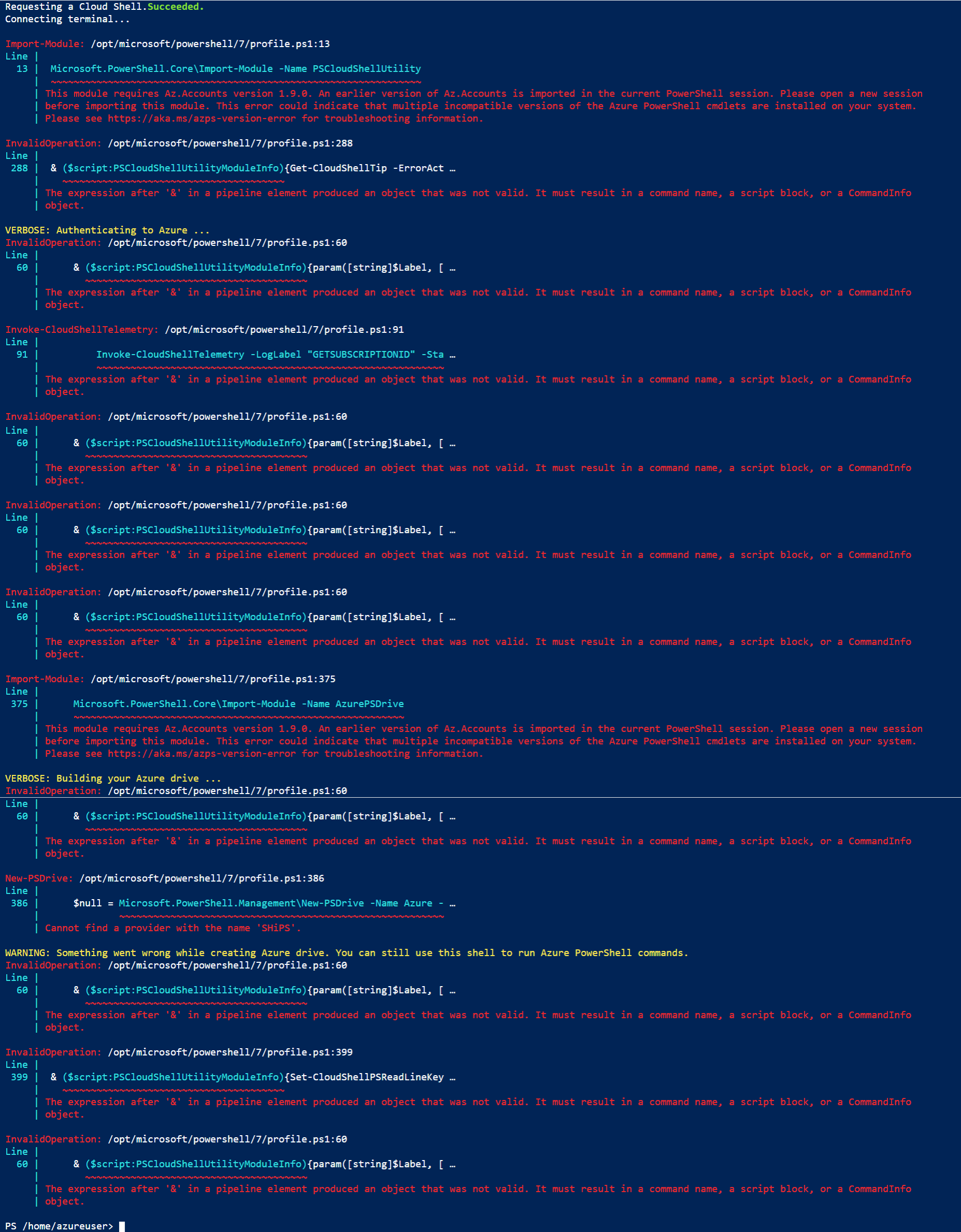 That said, I actually ran into a bizarre situation of a corrupted cloud shell. The error itself is pretty dang ugly and involves the inability to load Powershell within the Powershell window. If you tried to remove Powershell modules like, nothing could happen. Here's a taste of the nightmare when you opened a new instance: